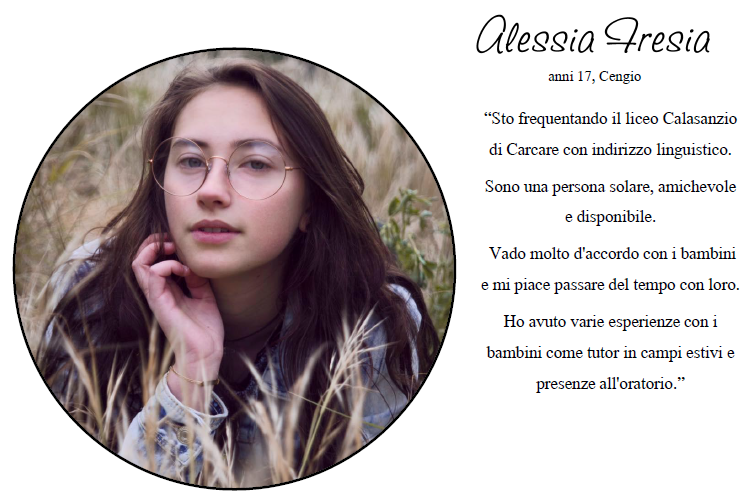Se dovesse servirti, non dimenticarlo: abbiamo un numeroso gruppo di ragazzi pronto ad offrire un servizio babysitting di elevato livello. Sono tutti nostri volontari, preparati e bravi con i bambini. Prendi qualche minuto per leggere le loro storie.
